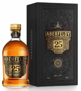 Surnommée « The Golden Dram », Aberfeldy signe avec cette version de 25 ans un single malt d’une grande intensité. Vieilli longuement et affiné en fûts de sherry, il développe des arômes profonds de figues, raisins secs, chocolat noir et bois noble. La bouche, ample et chaleureuse, reflète le style miellé emblématique de la distillerie. Rare et structuré, ce whisky séduit par sa richesse aromatique et son élégance maîtrisée, porté par le savoir-faire de la Master Blender Stephanie Macleod (480 €).